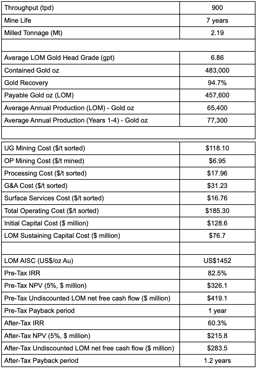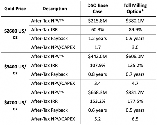 Table 2: Scottie Gold Mine DSO PEA Summary (Base Case), assumes a 5% discount rate and a gold price of US$2600.