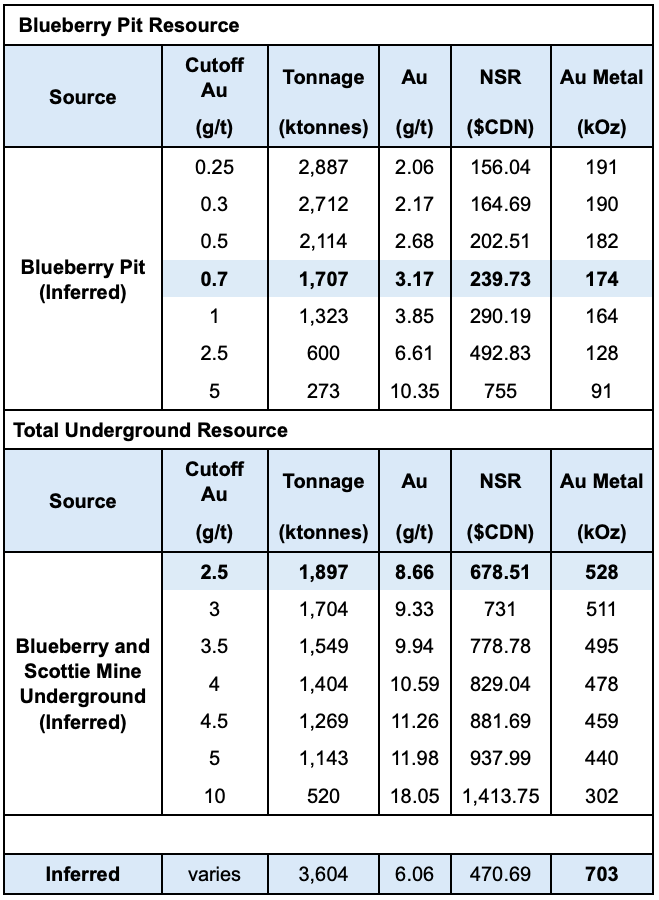 Note: BB UG = Blueberry underground, Scottie UG = Scottie underground, BB OP = Blueberry open pit, Au = gold grade (g/t), kt = thousand tonnes