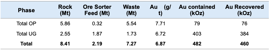 The combined Resource material selected as ore sorter feed is summarized in Table 3 and the base case production schedule used in the preliminary cashflow analysis is shown in Figure 1.