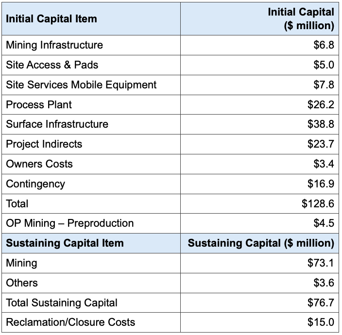 The PEA estimates initial capital requirements of $128.6 million and cumulative sustaining capital of $76.7 million (Table 4).