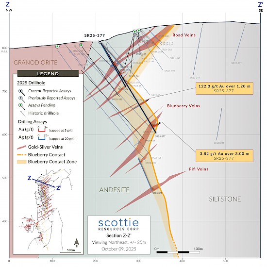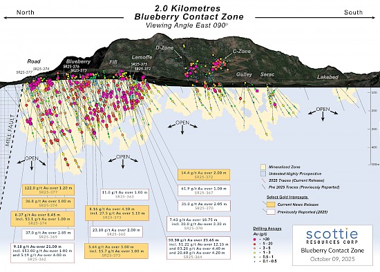 Vancouver, BC – October 9, 2025 – Scottie Resources Corp. (“Scottie” or the “Company”) (TSXV: SCOT OTCQB: SCTSF FSE:SR80) is pleased to report new assays from its 2025 drilling of the Blueberry Contact Zone within the Scottie Gold Mine Project. The road-accessible Scottie Gold Mine Project, which includes the 100%-owned past-producing Scottie Gold Mine and the adjacent Blueberry Contact Zone, is located 35 kilometres north of Stewart, BC.