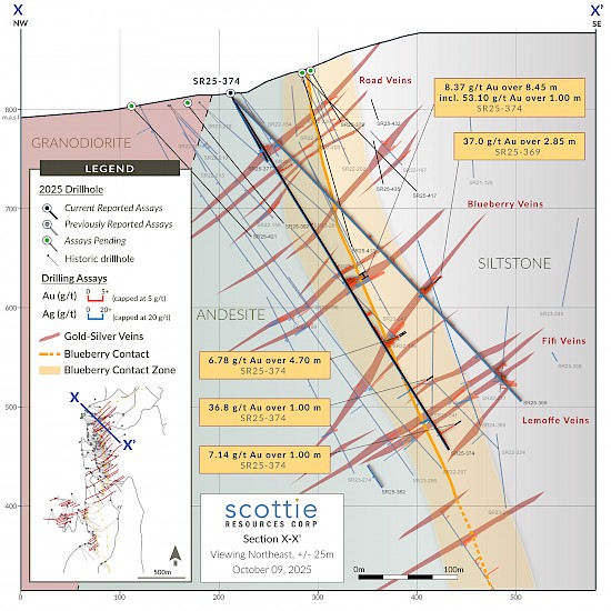 - Blueberry Contact drillhole SR25-374 intersected 8.37 grams per tonne (g/t) gold over 8.45 metres (m), including 53.1 g/t gold over 1.0 m at the Blueberry vein zone. The hole also intercepted an additional Blueberry zone vein grading 6.78 g/t gold over 4.7 m (Table 1, Figures 1,2,3).