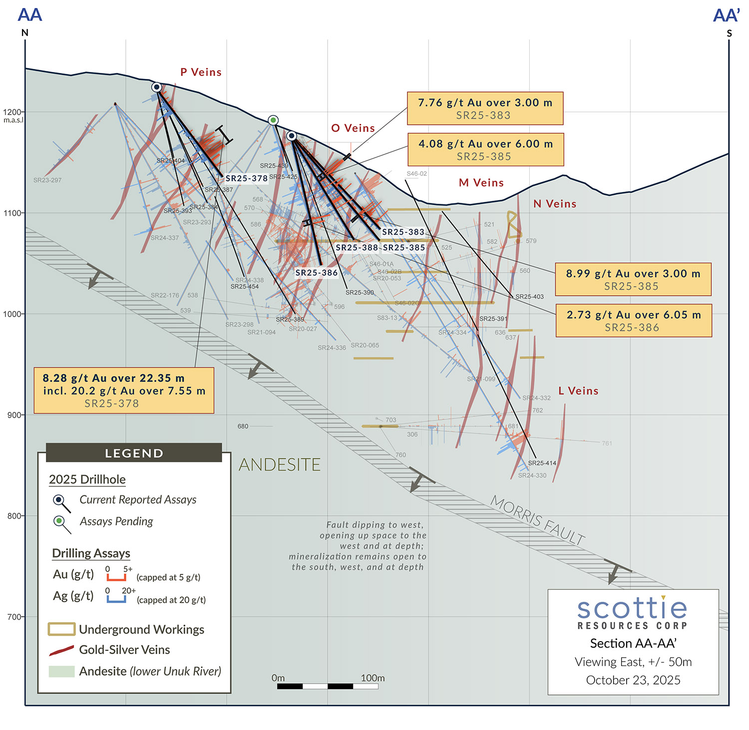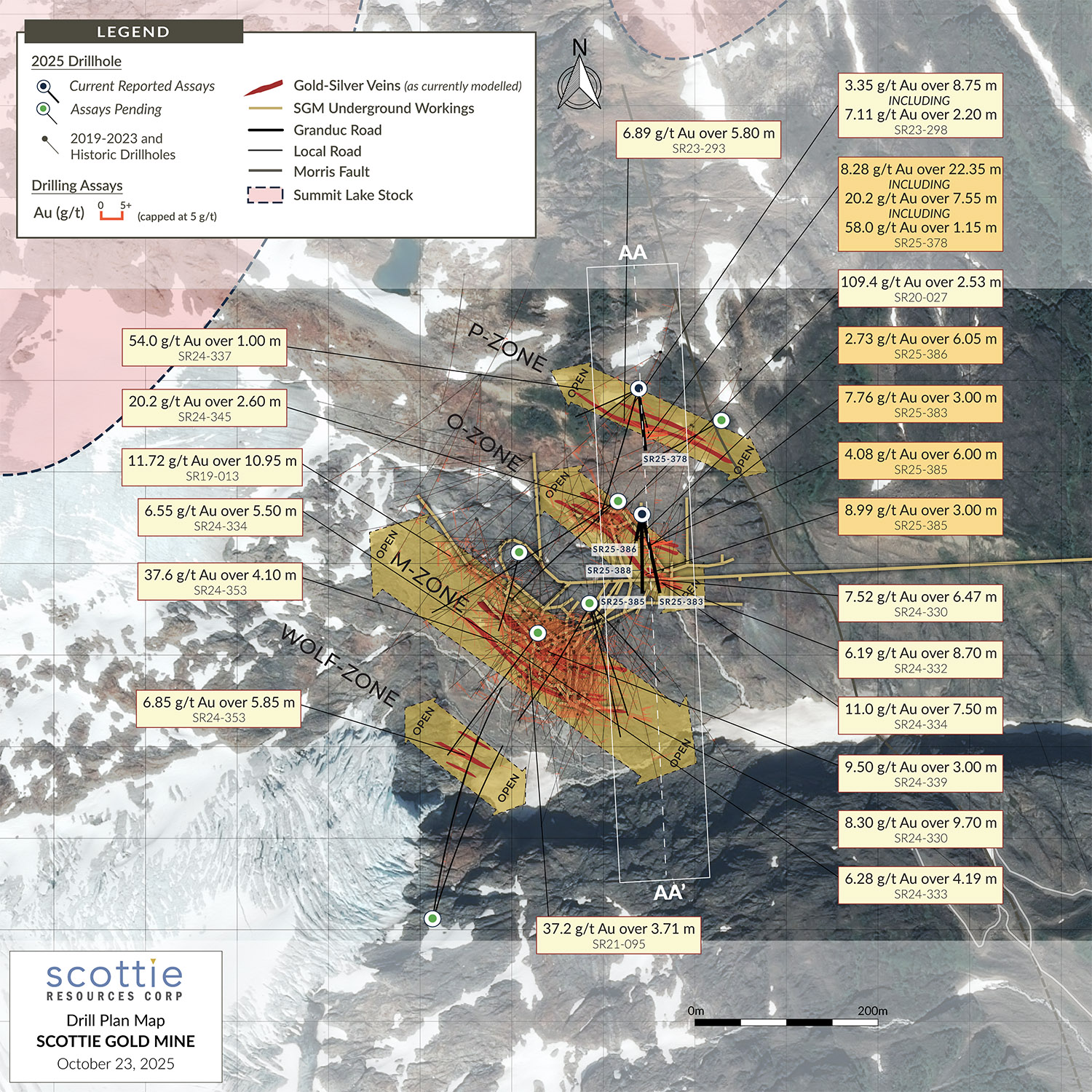 - Scottie Gold Mine drillhole SR25-378 intersected 8.28 grams per tonne (g/t) gold over 22.35 metres (m), including 20.2 g/t gold over 7.55 m on the P-Zone (Table 1, Figures 1,2,4).