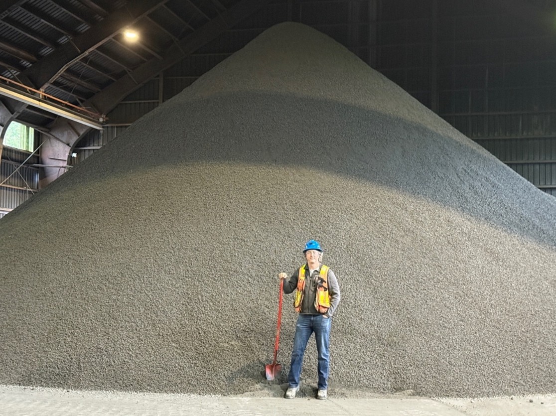 Figure 2 - Photo of Bulk Sample at Stewart Bulk Terminal awaiting transport. Product has been crushed to ½” minus. Scottie COO Sean Masse for scale.