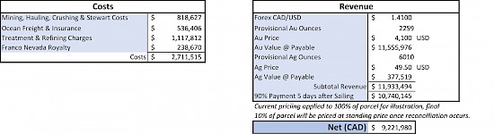 The final 10% payment will be used to account for any discrepancy between the provisional ounces and final ounces. The final payment is based upon the metals pricing when the grade is finalized and agreed.