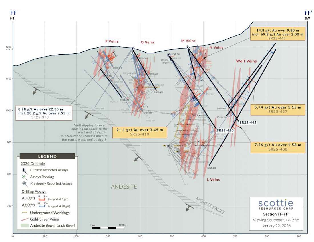 These results represent the conclusion of 2025 drill results from the Scottie Gold Mine and associated vein zones, i.e., P-, M-, N-, L-, and Wolf Zones. Drill results are still outstanding for the Blueberry Contact Zone and will be released as they have been validated and interpreted.