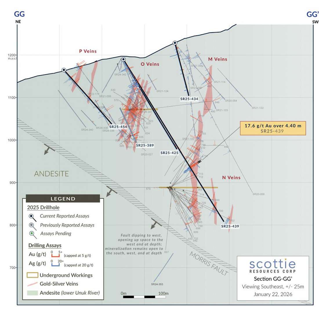 Vancouver, BC – January 22, 2026 – Scottie Resources Corp. (“Scottie” or the “Company”) (TSXV: SCOT OTCQB: SCTSF FSE:SR80) is pleased to report new assays from its 2025 drilling of various zones within and around the historic Scottie Gold Mine, part of the the Scottie Gold Mine Project (“Scottie Gold Mine” or the “Project”). The road-accessible Scottie Gold Mine Project, which includes the 100%-owned past-producing Scottie Gold Mine and the adjacent Blueberry Contact Zone, is located 35 kilometres north of Stewart, BC, and is the subject of a newly released Preliminary Economic Assessment (“PEA”) entitled Scottie Gold Mine Project (see news release dated October 28, 2025).