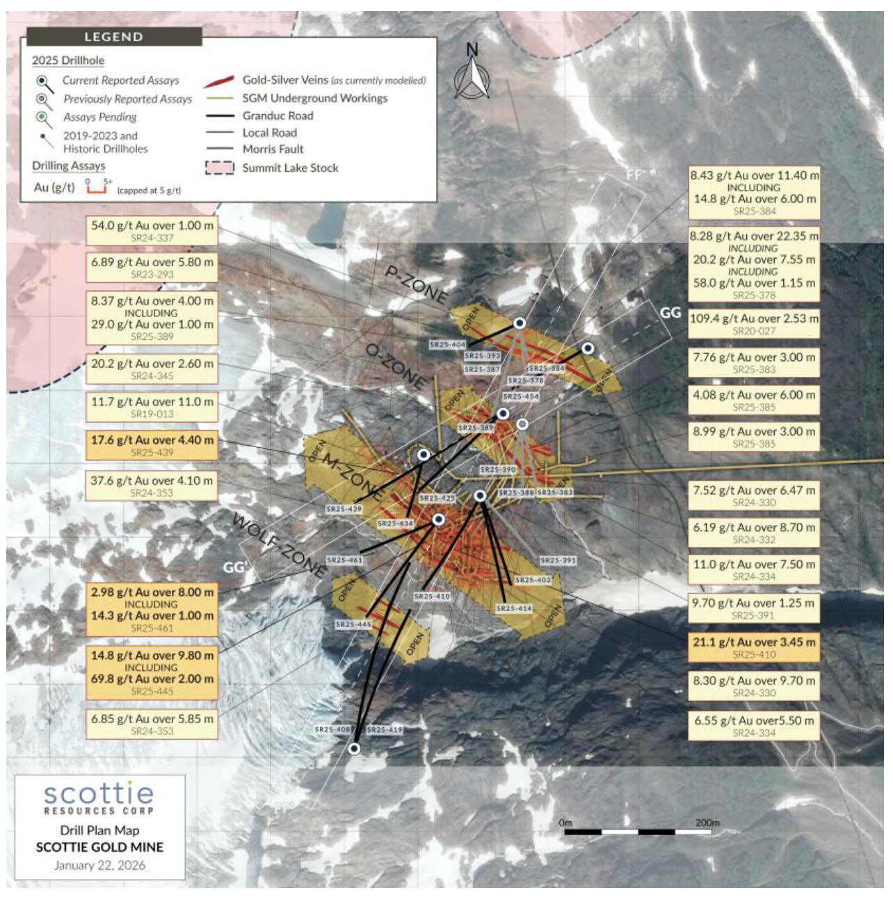 Vancouver, BC – January 22, 2026 – Scottie Resources Corp. (“Scottie” or the “Company”) (TSXV: SCOT OTCQB: SCTSF FSE:SR80) is pleased to report new assays from its 2025 drilling of various zones within and around the historic Scottie Gold Mine, part of the the Scottie Gold Mine Project (“Scottie Gold Mine” or the “Project”). The road-accessible Scottie Gold Mine Project, which includes the 100%-owned past-producing Scottie Gold Mine and the adjacent Blueberry Contact Zone, is located 35 kilometres north of Stewart, BC, and is the subject of a newly released Preliminary Economic Assessment (“PEA”) entitled Scottie Gold Mine Project (see news release dated October 28, 2025).