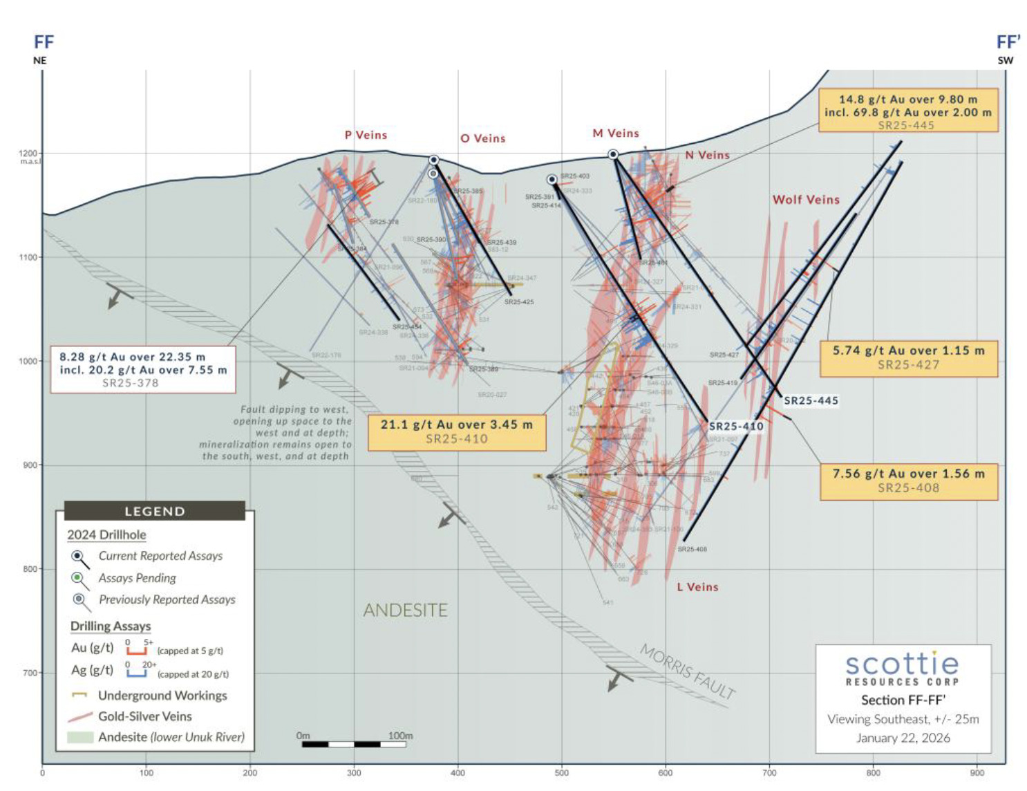 These results represent the conclusion of 2025 drill results from the Scottie Gold Mine and associated vein zones, i.e., P-, M-, N-, L-, and Wolf Zones. Drill results are still outstanding for the Blueberry Contact Zone and will be released as they have been validated and interpreted.