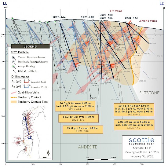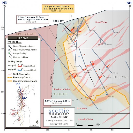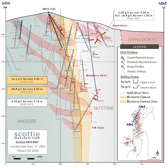 Vancouver, BC – February 3, 2026 – Scottie Resources Corp. (“Scottie” or the “Company”) (TSXV: SCOT OTCQB: SCTSF FSE:SR80) is pleased to report new assays from its 2025 drilling of various zones within the Blueberry Contact Zone, at the Scottie Gold Mine Project (“Scottie Gold Mine” or the “Project”). The road-accessible Project is located 35 kilometres north of Stewart, BC, and is the subject of a newly released Preliminary Economic Assessment (“PEA”) entitled Scottie Gold Mine Project (Bird et al., October 28, 2025, Scottie Gold Mine Project, SEDAR+).