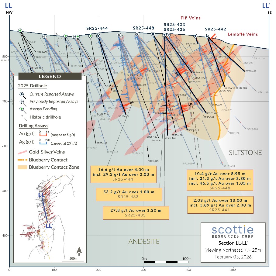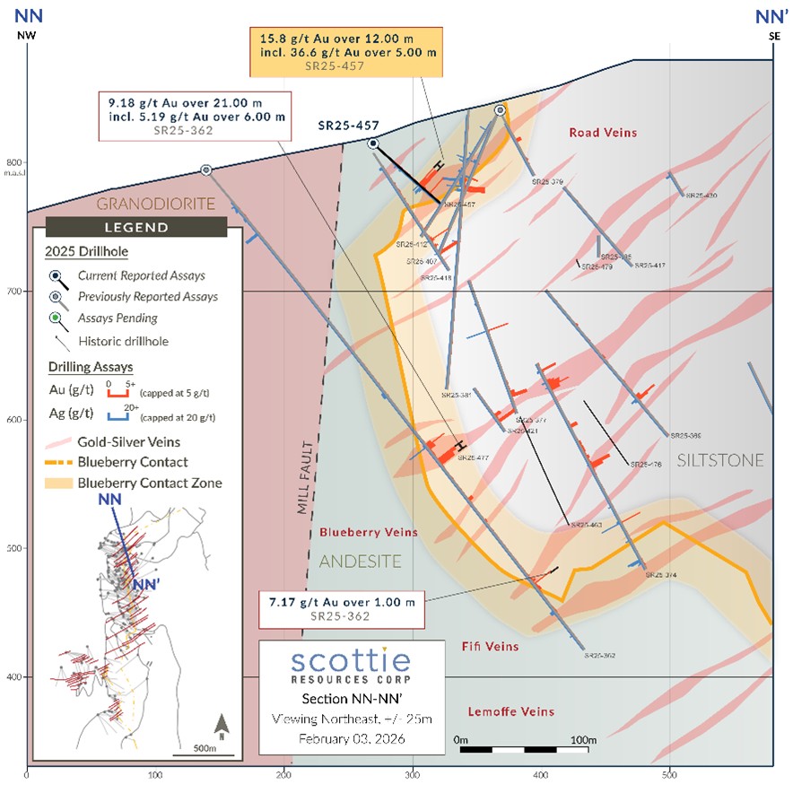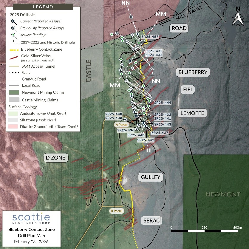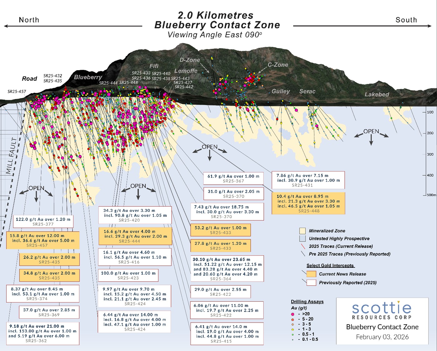 Vancouver, BC – February 3, 2026 – Scottie Resources Corp. (“Scottie” or the “Company”) (TSXV: SCOT OTCQB: SCTSF FSE:SR80) is pleased to report new assays from its 2025 drilling of various zones within the Blueberry Contact Zone, at the Scottie Gold Mine Project (“Scottie Gold Mine” or the “Project”). The road-accessible Project is located 35 kilometres north of Stewart, BC, and is the subject of a newly released Preliminary Economic Assessment (“PEA”) entitled Scottie Gold Mine Project (Bird et al., October 28, 2025, Scottie Gold Mine Project, SEDAR+).