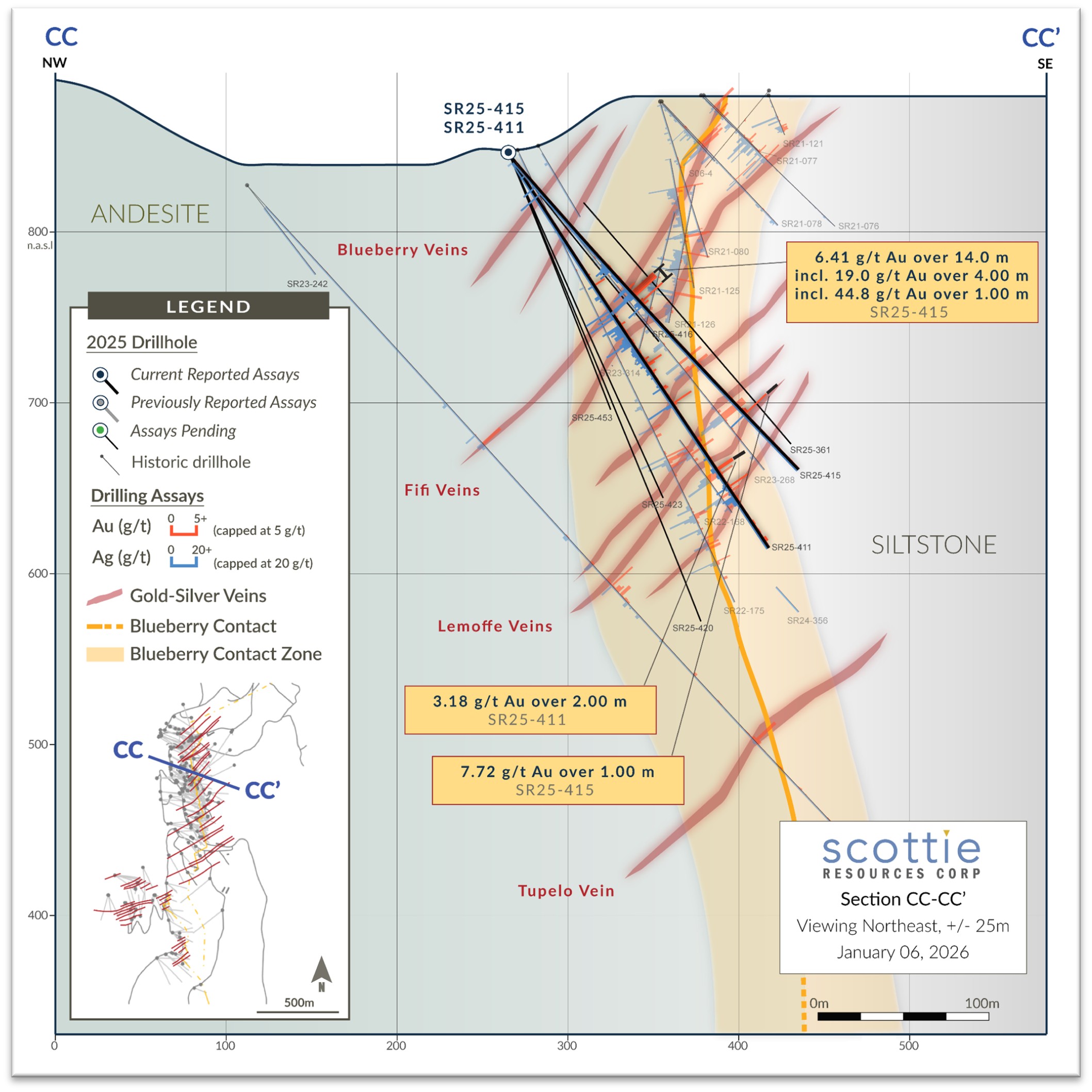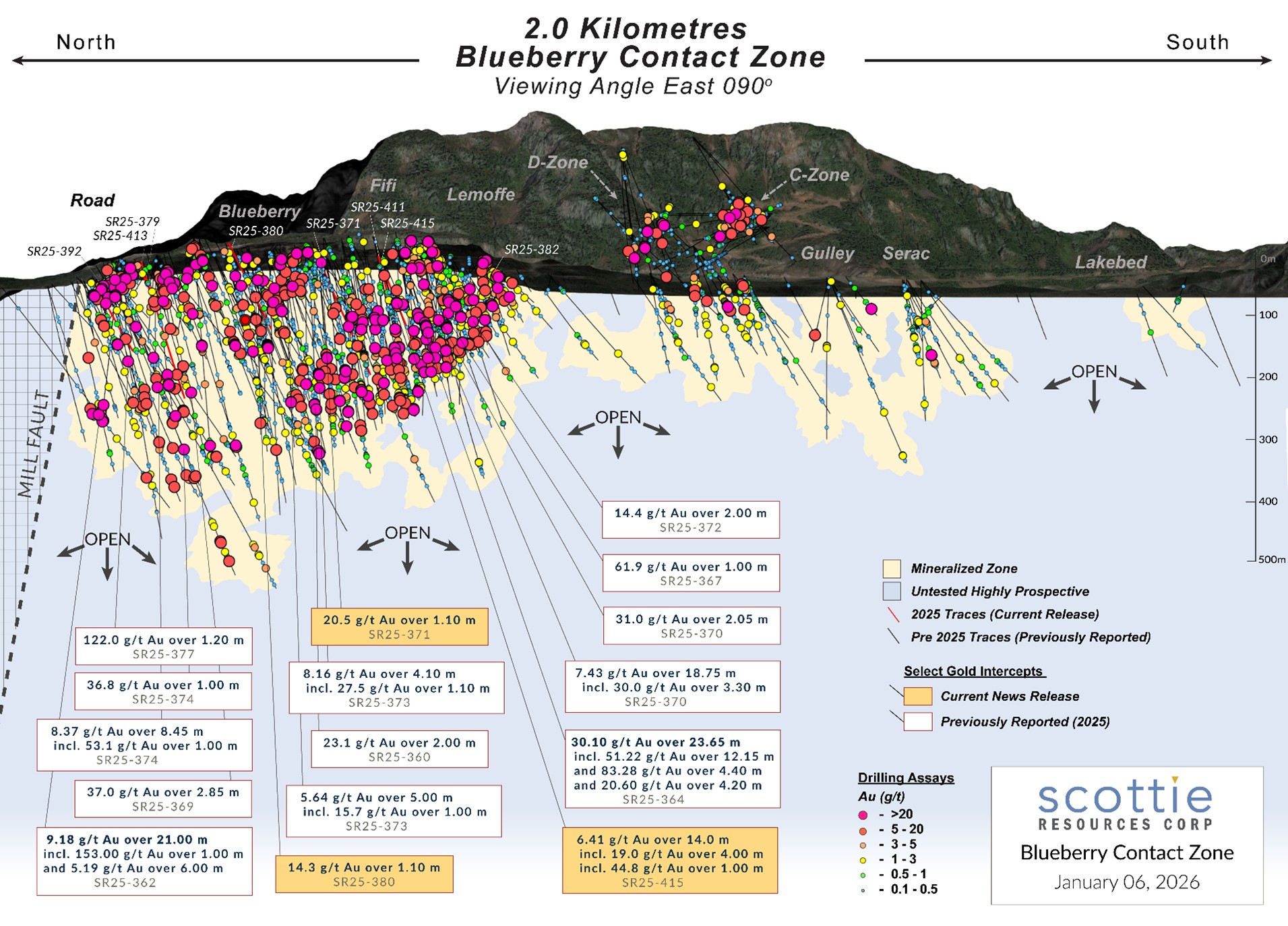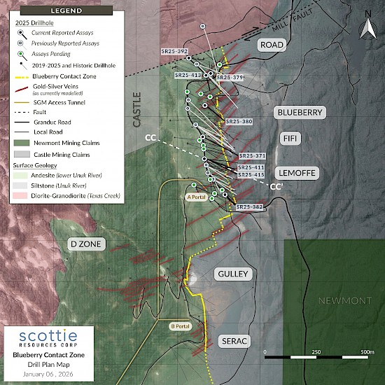 Vancouver, BC – January 6, 2026 – Scottie Resources Corp. (“Scottie” or the “Company”) (TSXV: SCOT OTCQB: SCTSF FSE:SR80) is pleased to report new assays from its 2025 drilling of the Blueberry Contact Zone within the Scottie Gold Mine Project (“Scottie Gold Mine” or the “Project”). The road-accessible Scottie Gold Mine Project, which includes the 100%-owned past-producing Scottie Gold Mine and the adjacent Blueberry Contact Zone, is located 35 kilometres north of Stewart, BC, and is the subject of a newly released Preliminary Economic Assessment (“PEA”) (Bird et al., October 28, 2025, Scottie Gold Mine Project, SEDAR+).